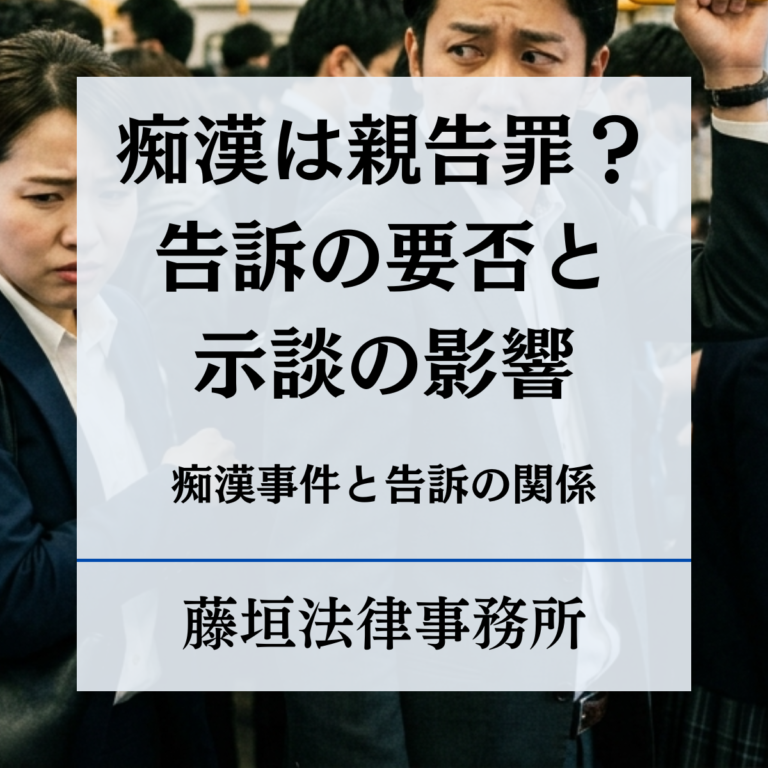 痴漢は親告罪なのか、それとも被害者の告訴がなくても処罰されるのか——この点は、事件に関わる立場によって大きな関心事となります。特に、示談が成立すれば処罰を免れる...