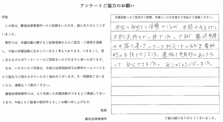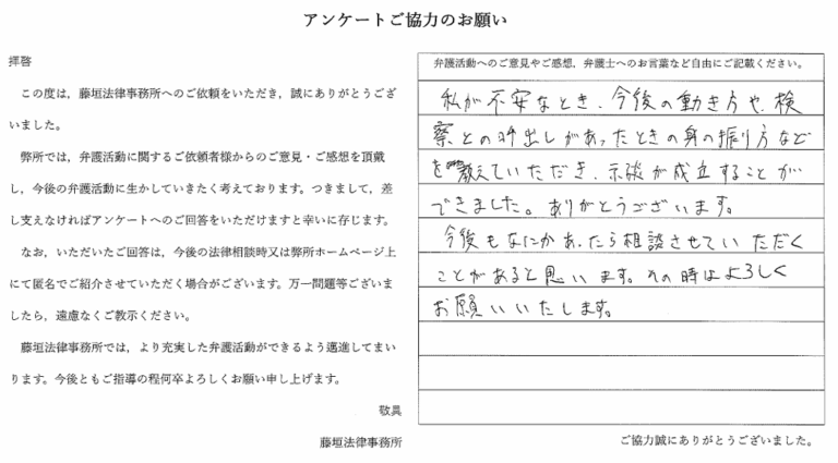藤垣法律事務所です。弊所に刑事事件分野のご依頼をいただいたお客様より頂戴したお客様の声をご紹介します。 ※事件や個人の特定を防ぐため,一部編集を行っている場合が...