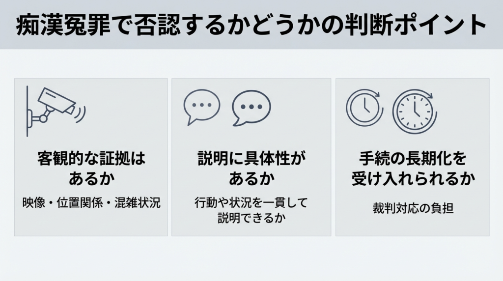 痴漢事件で身に覚えがない場合、否認するのは自然な反応です。ただし、否認を続けるかどうかは、感情だけで決めるべき問題ではありません。事実関係と証拠の状況を踏まえた判断が重要になります。