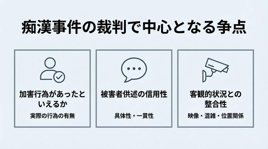 痴漢冤罪が争われる裁判では、個々の事案ごとに事情は異なるものの、無罪が問題となる場面にはいくつか共通する論点があります。これらは、裁判所が事実認定を行う際に特に慎重に検討するポイントでもあります。