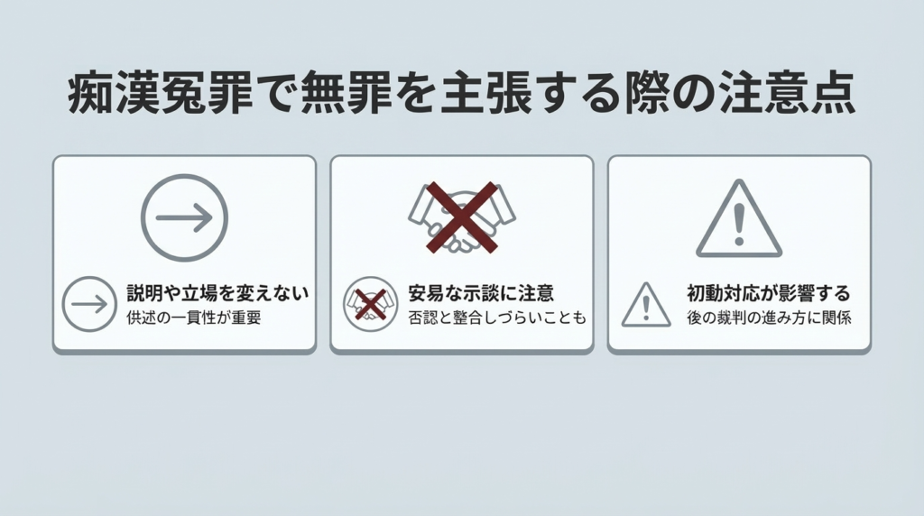 痴漢冤罪で無罪を主張する場合、まず注意したいのは、途中で説明や立場を安易に変えないことです。捜査や裁判の過程で話の内容が変わると、「事実関係が定まっていない」と受け取られ、供述全体の信用性に影響することがあります。