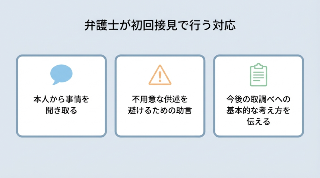 初回接見では、弁護士が本人から事情を聴き取るだけでなく、不用意な供述を避けるための助言や、今後の取調べに対する基本的な考え方を伝えます。また、家族に伝えるべき内容があれば、本人の了承を得たうえで家族に状況を説明することもあります。