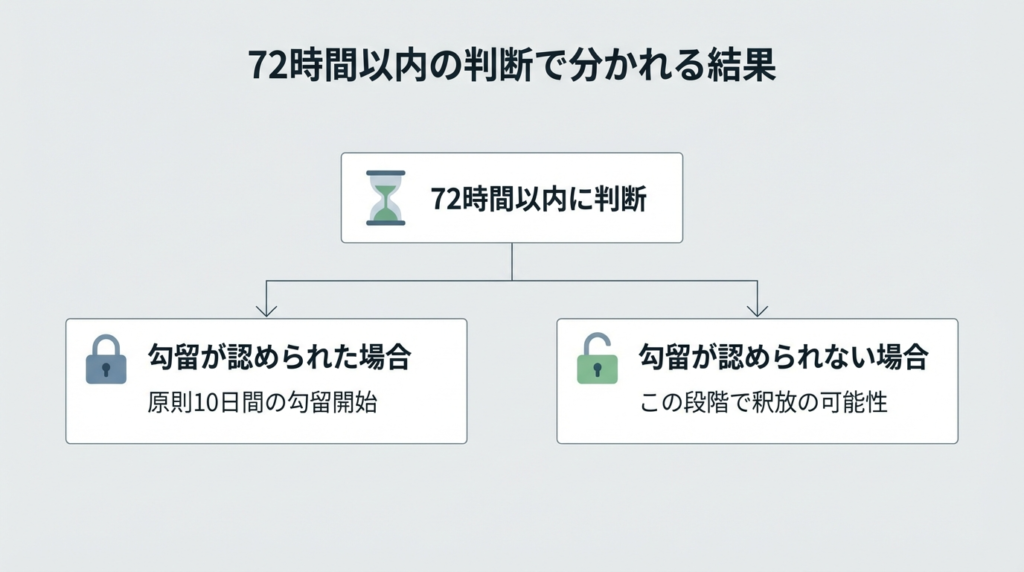 この期間内に勾留が認められた場合、裁判官の判断により、原則10日間の勾留が開始されます。一方で、勾留が認められなければ、この段階で釈放される可能性もあります。
