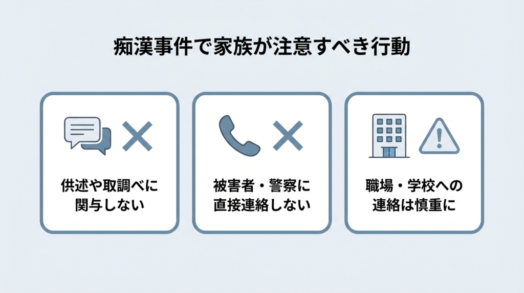 家族が痴漢の疑いで逮捕された場合、善意から行った行動であっても、結果として本人に不利な影響を及ぼすことがあります。この項では、家族として特に注意すべき行動を整理します。