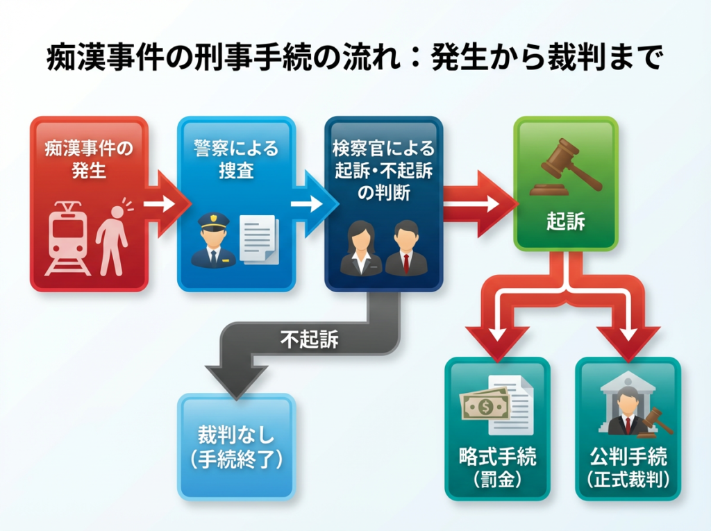 痴漢事件では、すべてのケースで裁判が開かれるわけではなく、不起訴処分となり裁判に至らない場合もあります。一方で、起訴された場合には、略式手続(罰金)または公判手続(正式な刑事裁判)として審理が行われます。