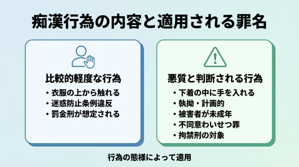 痴漢行為は、その内容や態様によって適用される法律が異なります。実務上、痴漢事件で問題となる主な罪名は、迷惑防止条例違反と不同意わいせつ罪の2つです。どちらが適用されるかによって、裁判の種類や結果は大きく変わります。