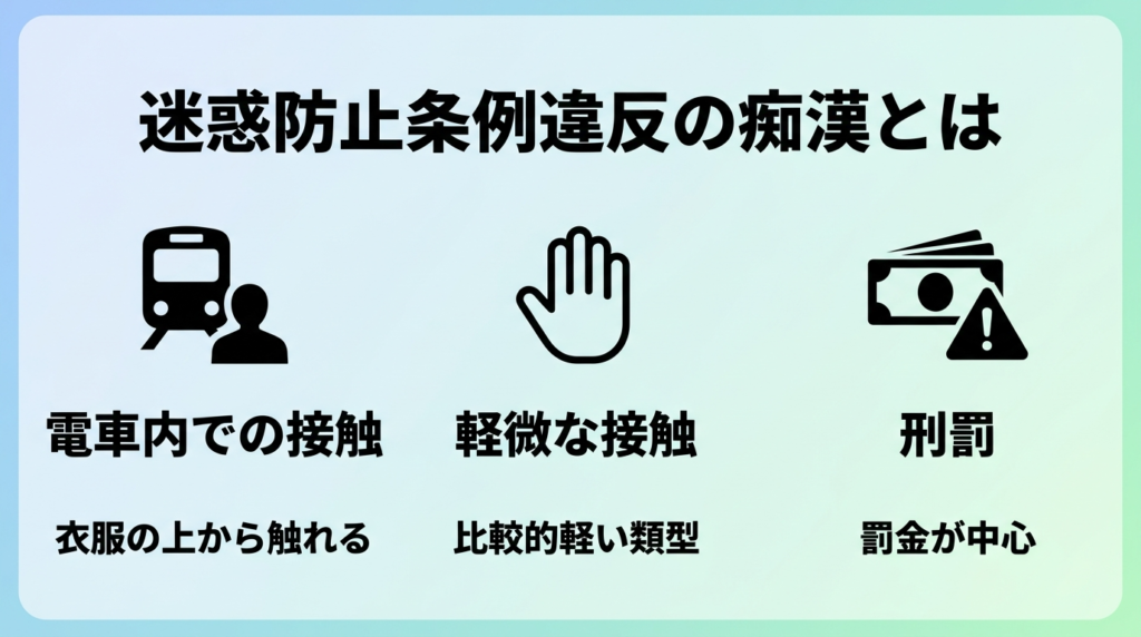 痴漢行為の中でも、比較的軽微な接触にとどまる場合には、各都道府県の迷惑防止条例違反として処罰されるのが一般的です。実務上、電車内やバス内などで発生する多くの痴漢事案は、この類型に該当します。