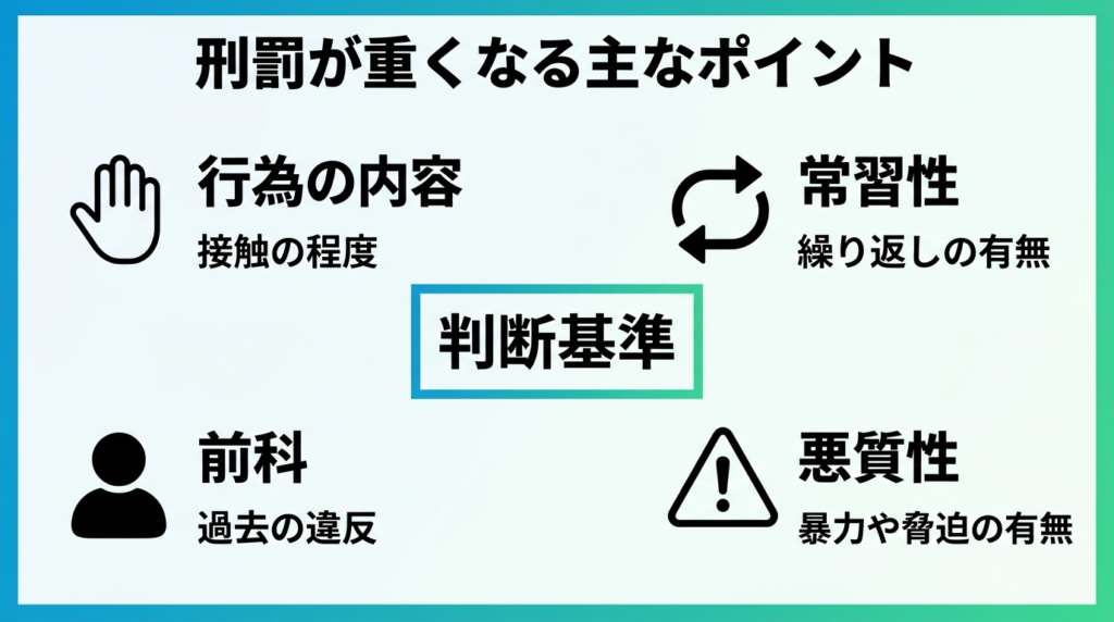 痴漢事件の刑罰は、単にどの法律が適用されるかだけで決まるものではなく、個別の事情を踏まえて総合的に判断されます。実務上は、行為の内容に加えて、常習性や前科の有無、被害の程度などが重要な判断要素となります。